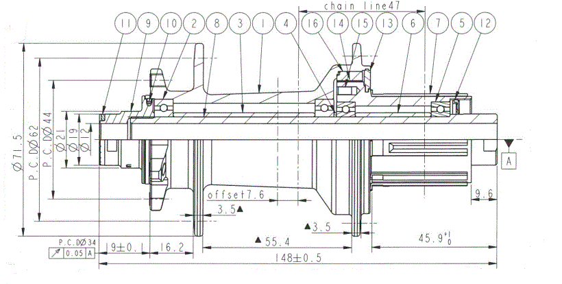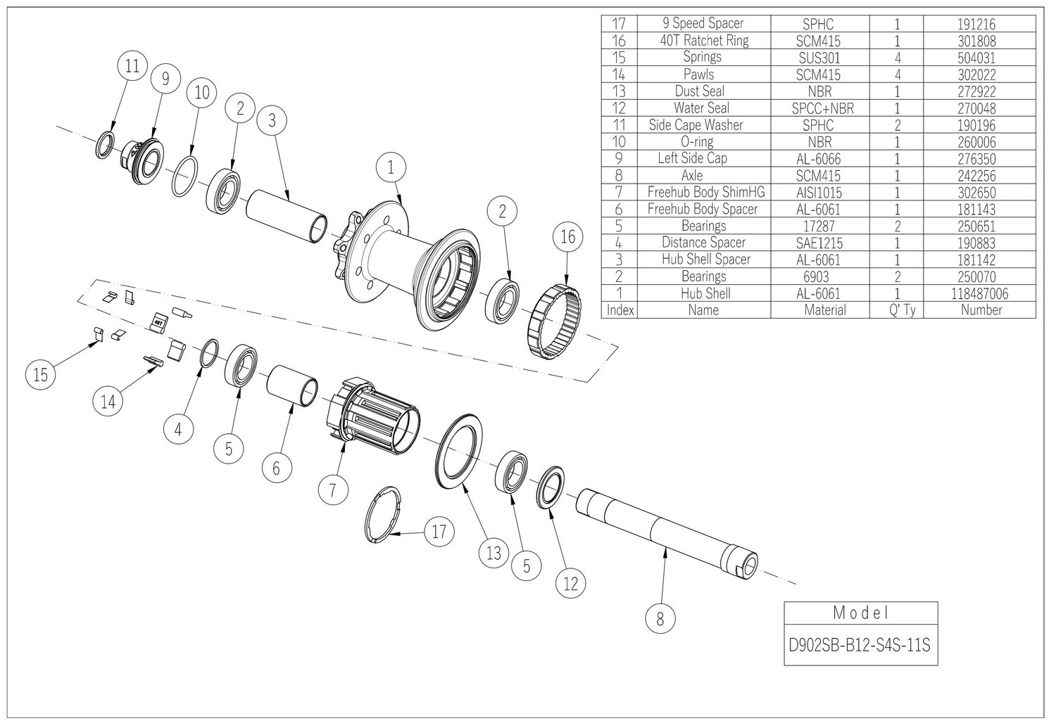 Hub rear D902SB-B12-S4S-11S, E-MTB, polished anodized black, 36H/14G, Alloy axle 12×148, w/o QR, D:45.9, 4xNBK bearings, Ratchet Ring 40T, Shim.11 Alloy H-TYPE (404 system) cassette body (E440), 4-PAWLS, with 1.5mm 9-speed spacer, black side caps, with Novatec Laser logo, OEM